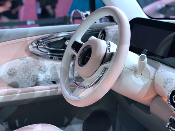 粉白皮質(zhì)雙輻式多功能方向盤,皮質(zhì)座椅之上印有玫瑰花紋,還有以鏤空以及“鉆石”包圍工藝設(shè)計(jì)的中央扶手箱,處處透著精致優(yōu)雅氣息。