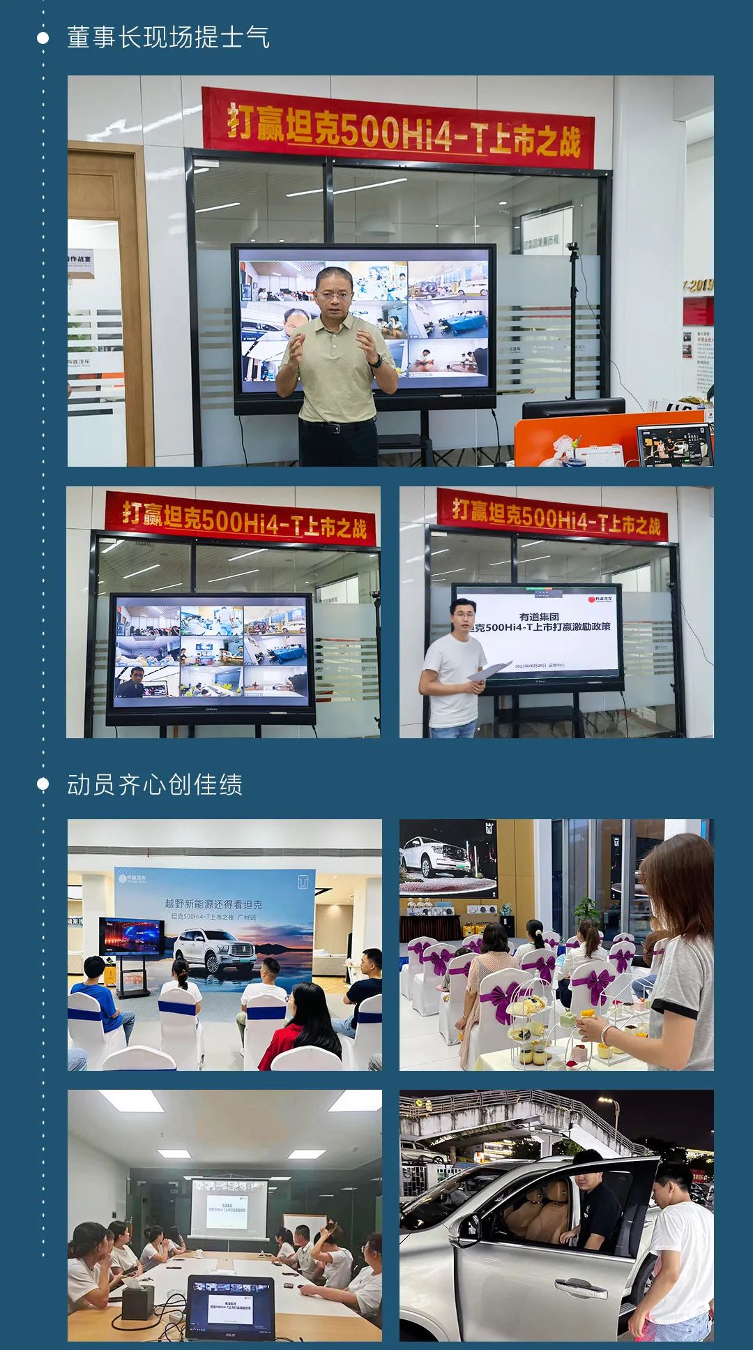 上市發(fā)布會(huì)直播當(dāng)晚,有道汽車集團(tuán)董事長(zhǎng)林大昌先生帶領(lǐng)有道集團(tuán)及兩廣一湖12個(gè)有道坦克品牌店同步啟動(dòng)“坦克500 Hi4-T上市之夜”活動(dòng),在現(xiàn)場(chǎng)公布激勵(lì)權(quán)益,鼓勵(lì)全員沖刺作戰(zhàn)。