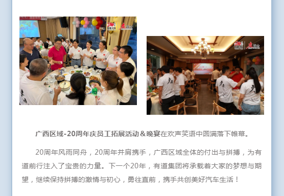 20年的汗水,20年的成就,鑄就了有道20年的輝煌。為了活躍公司職工文化生活,增強(qiáng)企業(yè)凝聚力和向心力,增強(qiáng)員工之間團(tuán)結(jié)互助精神風(fēng)貌,促進(jìn)員工溝通交流,營(yíng)造良好團(tuán)隊(duì)氛圍,在有道20周年來(lái)臨之際,分別在兩廣一湖區(qū)域舉辦20周年慶員工團(tuán)建活動(dòng)。