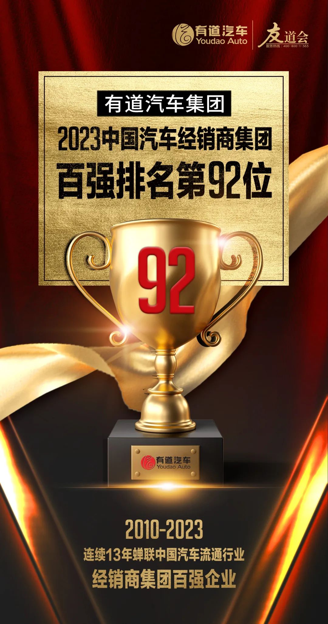 有道汽車集團(tuán)以汽車總銷量27671臺(tái),總營(yíng)業(yè)收入51.96億元,榮獲“2023中國(guó)汽車經(jīng)銷商集團(tuán)百?gòu)?qiáng)”第92名!