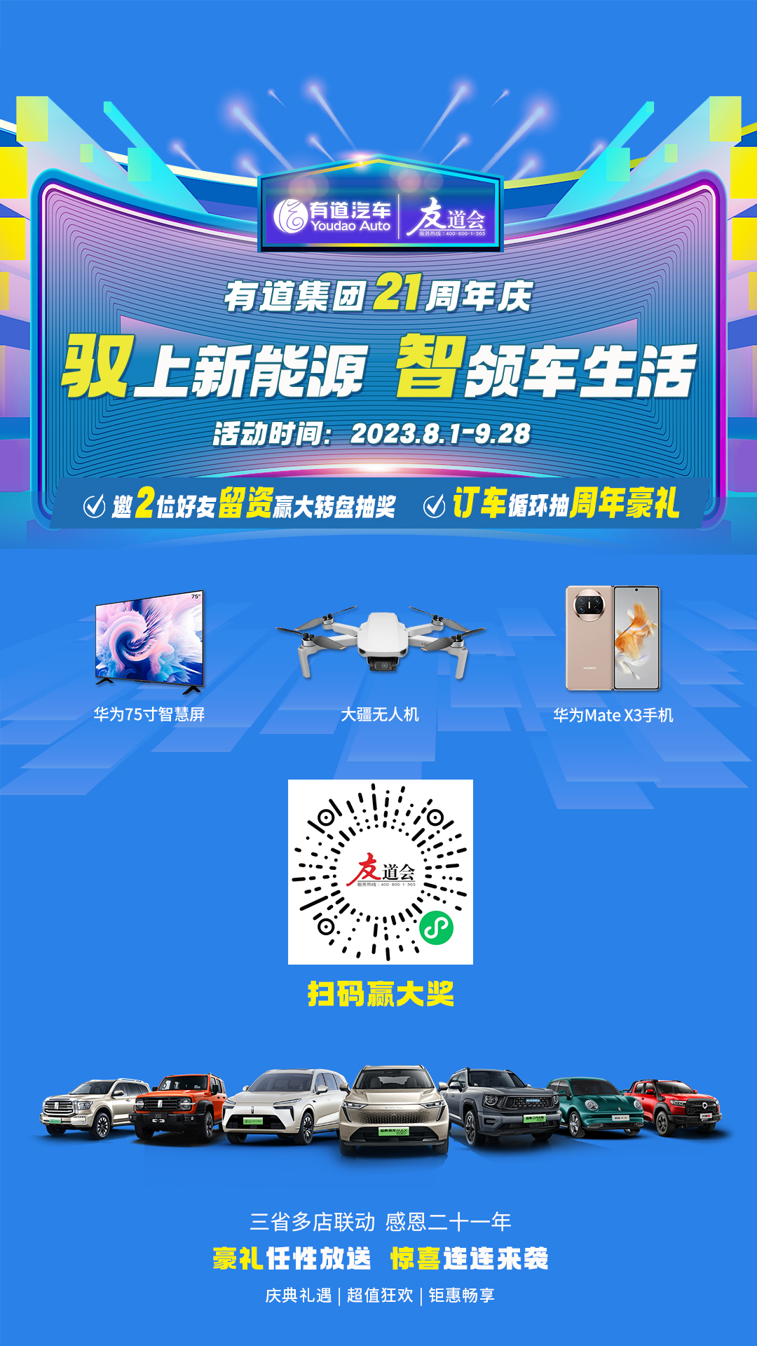 2023年是有道集團(tuán)向“智能新能源汽車”戰(zhàn)略轉(zhuǎn)型元年,隨著哈弗品牌、魏牌、坦克品牌“新能源”多款火爆新車逐步上市,有道軍團(tuán)重新出發(fā),挺進(jìn)新能源市場,推出主題為“馭上新能源?智領(lǐng)車生活”有道集團(tuán)21月周年慶,引領(lǐng)新老客戶進(jìn)入全新“智能車生活”。