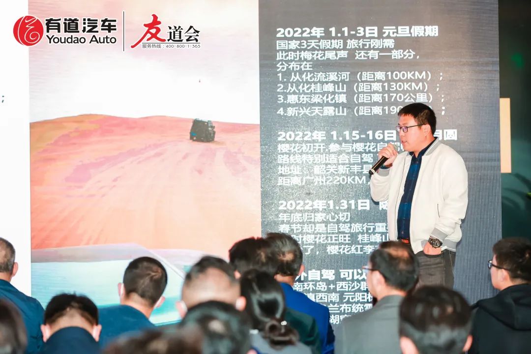 廣東大粵國際旅行社旅游經(jīng)理人/旅行設(shè)計(jì)師李建先生上臺(tái)分享與有道汽車集團(tuán)的合作項(xiàng)目。