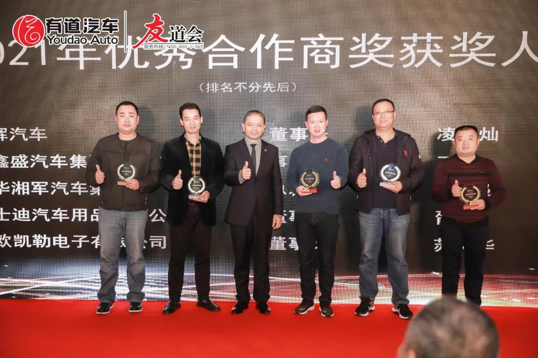 有道汽車集團(tuán)林大昌林董上臺(tái)為各位優(yōu)秀合作商頒獎(jiǎng),與2021年優(yōu)秀合作商獎(jiǎng)獲獎(jiǎng)嘉賓合影留念。